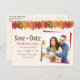 Spread the word with a "Save The Date" announcement for your autumn wedding featuring your custom photo and a border of colourful fall leaves and firefly lights on a string. Replace the placeholder photo with your special horizontal photo. Personalize the text in the template fields or click customize to select a font style, size, and colour you prefer.