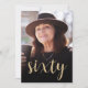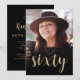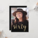 The front of this 60th birthday invitation features the guest of honour's photo with a gold-coloured text overlay. The word "sixty" appears in elegant gold-coloured calligraphy script. A dark screen helps make the text pop. Customize the reverse side with the name and party details on a black background. A great way to celebrate someone who's turning sixty!