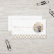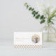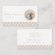 Destei's custom pet photo template design with white paws pattern on beige. Replace the sample Golden Retriever puppy photo with your own image and edit the personalizable text areas with the information of your profession. The photo is shown through a round shape that creates an uneven soft edge to any photo. The bottom of the card has a beige colour stripe with white dog paw print pattern on it. The front allows for a name and occupation while the back has space for business address and contact information.