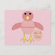 This postcard features a cute cartoon of a pink chick. The chick has a pale pink belly and darker pink wings and head with a yellow beak and feet. Next to the chick is a small egg.