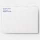 A custom return address envelope with blue script letters and covered in polka dots and circles, in light and dark blues on the back and the inside lining.