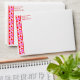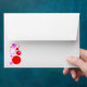 A custom return address envelope with editable red script letters for your return address, and covered in polka dots and circles, in red and pink on the front, back and the inside lining.