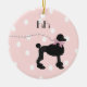 Fun round Christmas tree ornament done in pink with white polka dots. Graphics of a black poodle, with pink lease and bow decorates the front and back of the ornament. Personalize with your pet poodles name for a charming holiday ornament all their own.