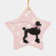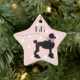 Fun star shaped Christmas tree ornament done in pink with white polka dots. Graphics of a black poodle, with pink lease and bow decorates the front and back of the ornament. Personalize with your pet poodles name for a charming holiday ornament all their own.