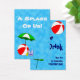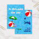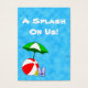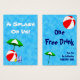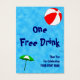 A custom business card sized event ticket template for free drinks, food or whatever you choose, with art of a pool umbrella and beach ball on watery blues.  Or customize it to change fonts, sizing and more, even save your design for later.