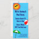 Custom party invitations with a fun swimming pool theme, decorated with a red beach ball, green umbrella, sandals and suntan oil on a watery blue background with curly waves. Click Customize It to change fonts or colours, even save your design for later.
