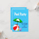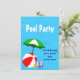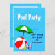 Custom party invitations with a fun swimming pool theme, decorated with a red beach ball, green umbrella, sandals and suntan oil on a watery blue background with curly waves. Click Customize It to change fonts or colours, even save your design for later.