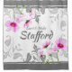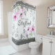 Brighten and personalize your bath with this elegant shower curtain in shades of grey. Dark bands edge the top and bottom with the large central expanse being white. The space is filled with leafy vines in various shades of grey and alternate corners feature arrangements of wispy pink cosmos flowers weaving their way through the grey blocks of colour . Add your first and last names in two deep coordinating grey hues. Perfect for your home decor or as a wedding gift for newlyweds or anniversary celebrations.