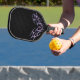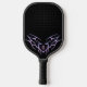 This custom black pickleball paddle has a purple tribal design personalized with a monogram initial.