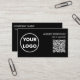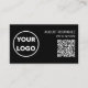 Look professional when you network with modern black business cards featuring your logo, name, title, and a customizable QR code on the front. The back features your company name, contact information, and slogan or other text in white text on black. Personalize the QR code with your website, portfolio, or landing page link and add your logo and text in the sidebar. Your logo can be any shape. White or light coloured logos will work best with the dark background.