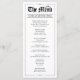 A stylish black and white Quinceañera menu designed with a modern, newspaper-inspired layout. Personalized with your event details, this interactive menu adds an elegant touch to each place setting while enhancing the overall table décor.