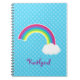 A bright rainbow with a cloud on one end, is on a teal blue background with light polka dots. Personalize it with your name.