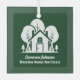 This forest real estate company Christmas ornament gift is perfectly customized for a realtor who is having an open house near the wilderness or woodlands. The green silhouette of trees behind a log cabin home and personalized with your agent and realty business name for marketing in the backwoods.