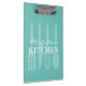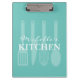 Custom recipe clipboard with cooking utensil print. Double side print with personalized name or monogram letters. Elegant turquoise blue design with knife, whisk, spoon and spatula. Handy kitchen accessories for him or her. Trendy personal gift ideas for Birthday, bridal shower, wedding, Mother's day and more. Elegant script typography template. Unique presents for chef cook, mom, wife, girlfriend, friend, family, etc. Also nice for restaurant, cafe, bar, etc.