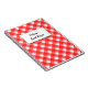 A custom recipe notebook with retro script letters on a faux doily and a diagonal red and white plaid pattern with overlapping thick and thin stripes.