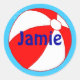 A red beach ball with a custom saying in fun letters on an ocean blue background.