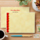 An editable envelope with red retro script and brown western letters and graphic art of red and orange BBQ flames on a faux parchment background.