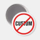 Custom red forbidden sign round magnets. Make your own prohibited icon kitchen magnet with anti text or image in the background. Round circle transparent overlay with diagonal cross vector design. Create a personalized stop warning or opposition protest against something. No smoking, no photos, no dogs etc.