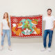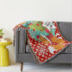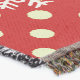 Customized Red Fox Christmas holiday throw blanket, colourful, fun, cute, and cheery! Features two red foxes with winter hat and scarves, a Christmas tree with red balls, and snowflakes of white on a background of aqua blue with a border of red with white polka dots. There's also a star shape banner you can personalize with your monogram initial!