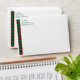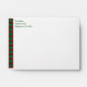 A custom A6 envelope with room for your return address on the front in green, handwritten letters and a red and green holiday plaid pattern with a Christmas theme on the side and inside lining.