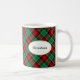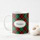 A custom coffee mug with vintage blackletter text and a retro red and green holiday plaid pattern.