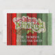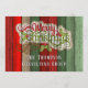 Beautiful, unique, classic, trendy, pretty and decorative Christmas holiday greeting card with a classic Holiday dark red, forest green, and white coloured 'Merry Christmas' quote text on a rustic weathered wooden country cottage farmhouse style planks pattern background. With room to easily customize or personalize with your company or family name, and room on the backside to write or print your own Holiday wish.
