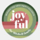 Contemporary classic Christmas holiday season gift label with light and dark green, pink and red coloured abstract pattern and JOYFUL wish text in crisp white. With room to customize or personalize with a family name (or individual names) and a personal season greeting message.