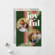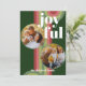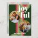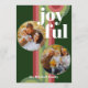 Contemporary classic Christmas holiday season greeting card with light and dark green, pink, and red coloured abstract pattern with crisp white JOYFUL wish text. With room to customize or personalize with two photos, a family name (or individual names) on the front, and a customizable season greeting message on the backside of the card.