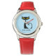 This personalized stainless steel red watch design features a retro mid century modern "atomic" black cat with big yellow eyes and a curly tail.