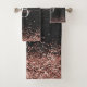 Easily personalize this trendy elegant bath towel set design featuring pretty rose gold sparkling glitter on a black brushed metallic background.
