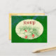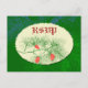 Custom RSVP postcards with elegant script letters in browns and Christmas or Holiday art vintage illustration of a pine bough in green with red pine cones inside a golden frame on a forest green background with a blue and green pine pattern. Click Customize It to add your name or message, even save your design for later.