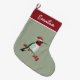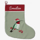 Custom Christmas stocking featuring a ruby-throated hummingbird wearing a Santa hat on a green background.