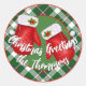Custom Santas Mittens On Red Green Plaid Pattern Classic Round Sticker