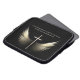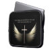 Christian religious cross with the wings of the Holy Spirit and personalized Scripture verse in gold and white on black. Leave the Bible verse as is or type in your favourite religious passage. Laptop sleeve computer cover reads "O give thanks unto the LORD; for He is good. For His mercy endureth for ever." You may change this verse if you prefer.