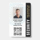 Personalized security ID badge with a modern geometric design. This editable template includes your ID photo, name, employee number, job title, company name, logo, expiration date, and a QR code or barcode. Ideal for various workplaces and professions such as private security guard, close protection officer, store security, personal bodyguard, official doorman, retail worker, medical staff pass, and more. Printed colours: blue, gold, black and white. Shop the collection for more badges and tags for sale online, designed for the security service industry.