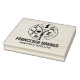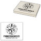 This custom stamp features a sewing utensil logo with a name and slogan.