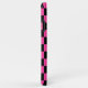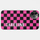 Fun funky black and hot pink coloured racing flags check pattern design. With room to personalize or customize with a name of your choice in bright white and black colours. Funky, elegant, stylish, and eclectic design for the fancy artistic fashionista, the artsy fashion diva, popular hip trendsetter, vintage retro art style, and abstract digital geometric motif lover who wants to protect their phone from dust and dirt, wear and tear. This design is available for Apple iPhone 6, 7, and 8 Plus, 10 or X, XR, XS, 11, 12, 13 Mini, 14, 14 Plus, and Pro Max cellphone cases. Show off your style, look fashionable, and feel stylish with a unique design on a mobile device accessory of your choice.