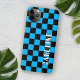 Fun funky black and bright azure blue coloured racing flags check pattern design. With room to personalize or customize with a name of your choice in white and black colours. Funky, elegant, stylish, and eclectic design for the fancy artistic fashionista, the artsy fashion diva, popular hip trendsetter, vintage retro art style, and abstract digital geometric motif lover who wants to protect their phone from dust and dirt, wear and tear. This design is available for Apple iPhone 6, 7, and 8 Plus, 10 or X, XR, XS, 11, 12, 13 Mini, 14, 15 Plus, and Pro Max cellphone cases. Show off your style, look fashionable, and feel stylish with a unique design on a mobile device accessory of your choice.