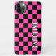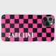 Fun funky black and hot pink coloured racing flags check pattern design. With room to personalize or customize with a name of your choice in bright white and black colours. Funky, elegant, stylish, and eclectic design for the fancy artistic fashionista, the artsy fashion diva, popular hip trendsetter, vintage retro art style, and abstract digital geometric motif lover who wants to protect their phone from dust and dirt, wear and tear. This design is available for Apple iPhone 6, 7, and 8 Plus, 10 or X, XR, XS, 11, 12, 13 Mini, 14, 14 Plus, and Pro Max cellphone cases. Show off your style, look fashionable, and feel stylish with a unique design on a mobile device accessory of your choice.