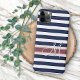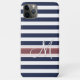 Contemporary dark midnight blue and white stripes pattern. With a banner to customize or personalize with the monogram of your choice. Beautiful, modern, and cool cover for the trend-savvy and art-loving hip trendsetter, artsy motif lover who wants to protect their phone from dust and dirt, wear and tear. This design is available in Apple iPhone 6, 7, and 8 Plus, 10 or X, XR, XS, 11, 12, 13 Mini, 14, 15 Plus, and Pro Max cellphone cases. Show off your style, look fashionable trendy, and feel stylish with a unique design on a mobile device accessory of your choice.