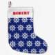 Custom small boat helm print Christmas stocking for sailor. Personalized nautical Christmas stocking for him or her. Ship wheel design for boat captain. Fun maritime Holiday decorations for home or office. Trendy sock sack with name. Cute gift idea for friend, family, kids, husband, dad, uncle, grandpa, wife, couple, etc. Add your own stocking stuffers. Navy blue and white colours.