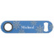 Stylish bartenders speed bottle opener done in sky blue with pretty silvery snowflakes. Personalize the white text to read what ever you want. Great gift idea.