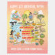 This bright and colourful scene offers a spectacular view of Southern California - wacky characters frolic on the beach and desert of SoCal showcasing Los Angeles, Orange County, San Diego, Santa Barbara, Palm Springs, El Centro, Beverly Hills, Laguna Beach, La Jolla, Anza Borrego, and Joshua Tree parks as well as the border cities of Tijuana, Tecate, and Mexicali. This charming scene has it all – a surfer hangs ten while a killer whale leaps out of the water, a hiker is noticed by a UFO, and much more…