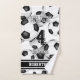 Choose your own colours! This team spirit hand towel for a soccer player features easy-to-personalize athlete name and jersey number plus team & mascot name overlying the background image of a bunch of randomly arranged soccer balls on a white background. The soccer balls are selectively shaded to give them a 3D appearance. The athlete's name can be personalized on horizontal black varsity stripes at the bottom edge of the towel. Customize the text and varsity stripes colours to match the soccer team's colours or an athlete's favourite colours--press the "Edit this design" button above to access the Zazzle design tool where you change the towel's background colour, the colour of the varsity stripes, and all text colours - by katz_d_zynes