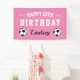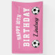 Custom soccer theme Happy Birthday party banner. Soccer ball design with fun typography and custom pink background colour.