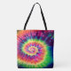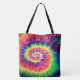 A custom canvas tote bag that features a retro tie-dye pattern.