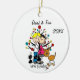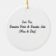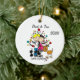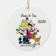 Customer request stick figure holiday ornament features an expectant couple in front of the holiday tree. Man with blonde hair, woman with dark hair. Also includes a yellow lab dog and two black cats. Names and date added as well as text on ornament back.