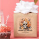 This customizable Halloween sticker features an ornate sugar skull surrounded by lush orange and golden flowers, blending Día de los Muertos inspiration with gothic romance style. The warm autumn palette and detailed florals make it a standout choice for party favours, treat bags, or seasonal gifts. Personalize with your family name or message.