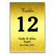 Personalized wedding table card with template text for a number, names and date; golden and yellow retro design with bokeh circles texture;