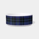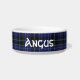 Traditional blue and black Clark clan tartan plaid around this white ceramic dog bowl. Custom white text is ready to personalize with your pet's name. Makes a great gift idea to a new dog owner.